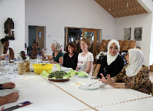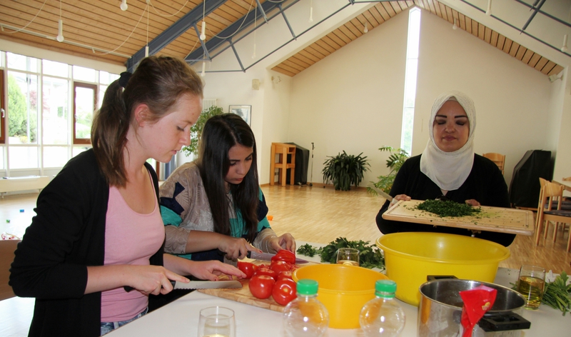 Wenn es etwas gibt, das alle Menschen verbindet – egal welcher Religion, Abstammung oder Kultur – dann ist es definitiv das Essen. Am Nachmittag des 13. Mais trafen sich einige Frauen des Arbeitskreises mit syrischen und afrikanischen Flüchtlingen, um gemeinsam zu kochen. In der Küche des katholischen Gemeindehauses wurde fleißig geschnippelt, gebraten und gewürzt. Für das arabische Taboulé wurden frische Petersilie, Zwiebeln und Tomaten in feine kleine Stückchen geschnitten, während die Afrikanerinnen am Herd ein landestypisches Reiscurry zubereiteten. Anschließend saß man gemütlich zusammen am Tisch und genoss die internationalen Gaumenfreuden. Es entstanden rege Gespräche und man verabredete sich unter anderem zum „Schwäbischen Kochen“ und zum gemeinsamen Walken. Der nächste Termin für das internationale Kochen wird hier auf der Webseite und auf Facebook bekannt gegeben.