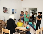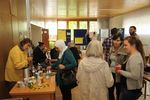 Eine erstaunlich große Zahl von ihnen war der Einladung gefolgt, auch mit ihren Kindern, so dass die üblichen Hemmschwellen bald überwunden wurden und sich zahlreiche intensive Gespräche entwickelten. Zum Erstaunen vieler erwies sich die Sprachbarriere nicht als unüberwindlich, denn einige Flüchtlinge beherrschen die deutsche Sprache schon ziemlich gut, wenn nicht, hilft bisweilen Englisch oder Französisch weiter und schließlich gibt es eine Kommunikation, die international funktioniert: ein Lächeln und der Gebrauch von Händen und Füßen.
